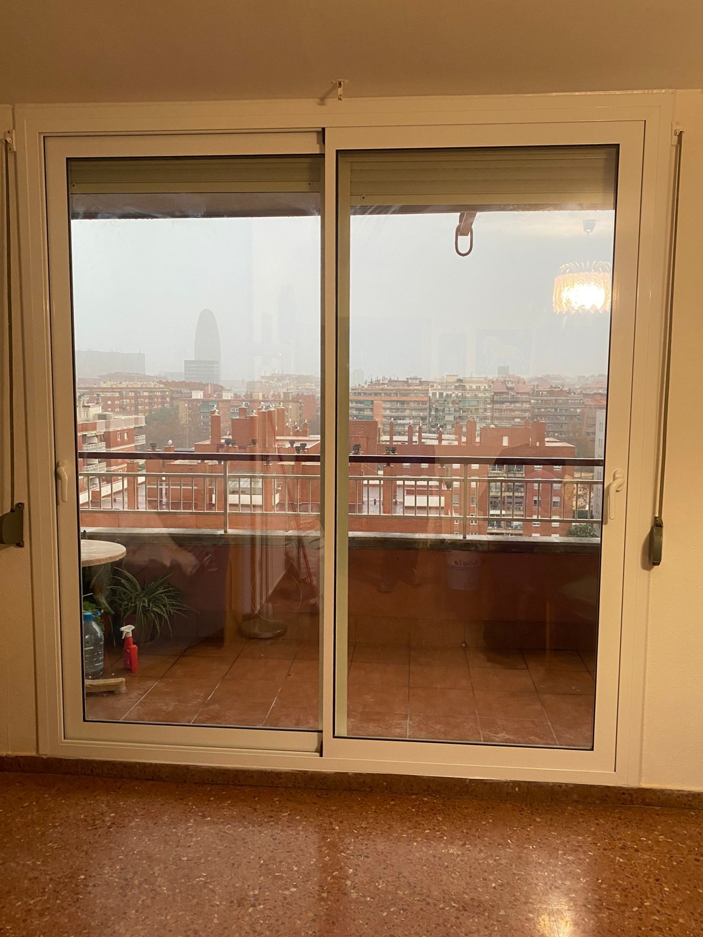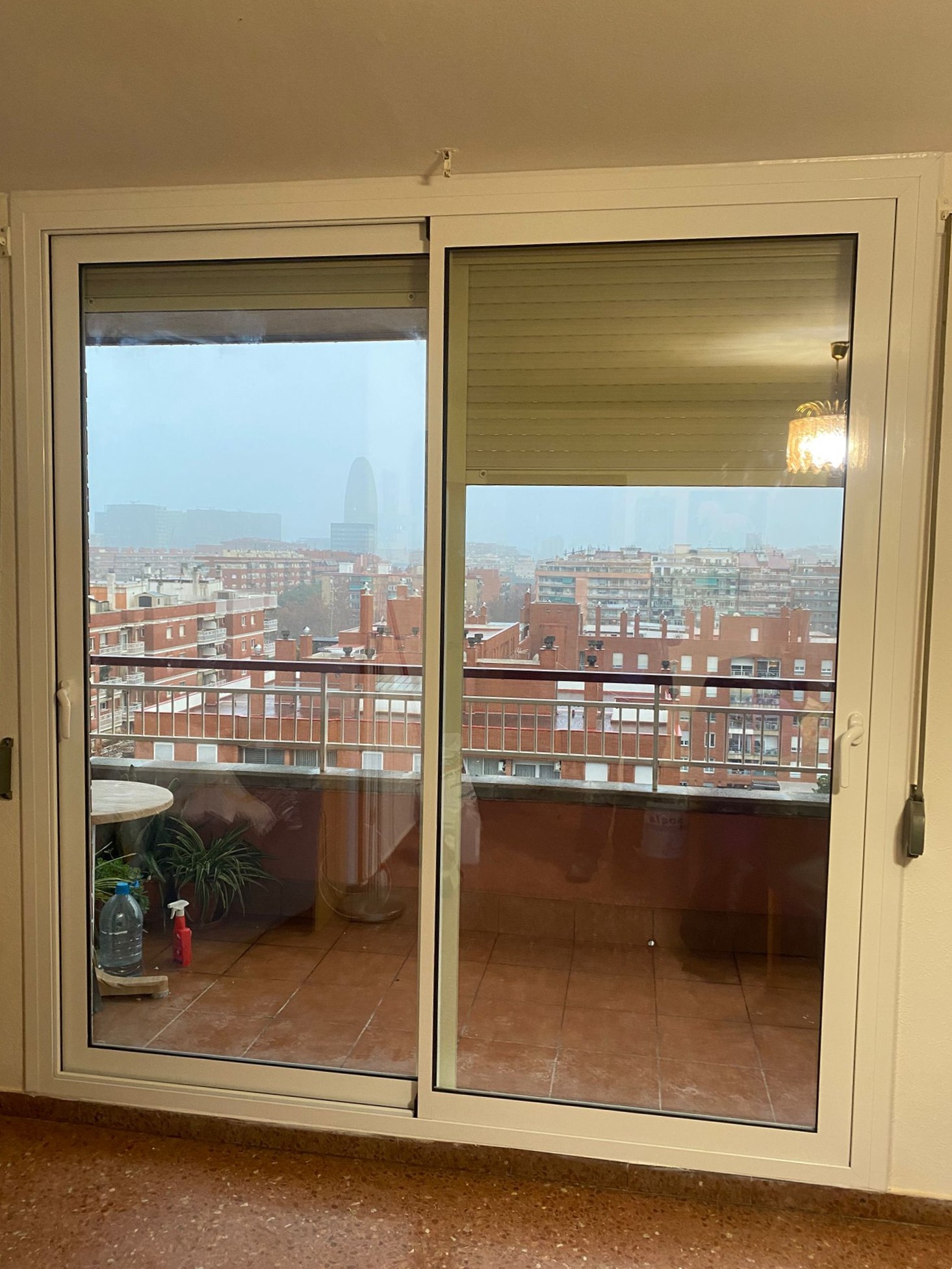 Balconera corredera de dos hojas con vidrio climalit® 4/12 gas argón /4+4 silence sgg planitherm 4s® de la serie SILVER 76 RPT Minimalista en lacado blanco, con forro de 45 mm. Medida: 2200 x 2380 mm.