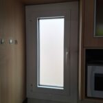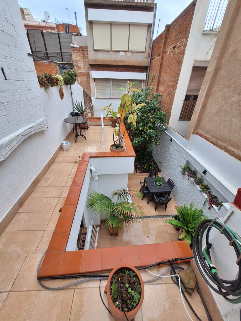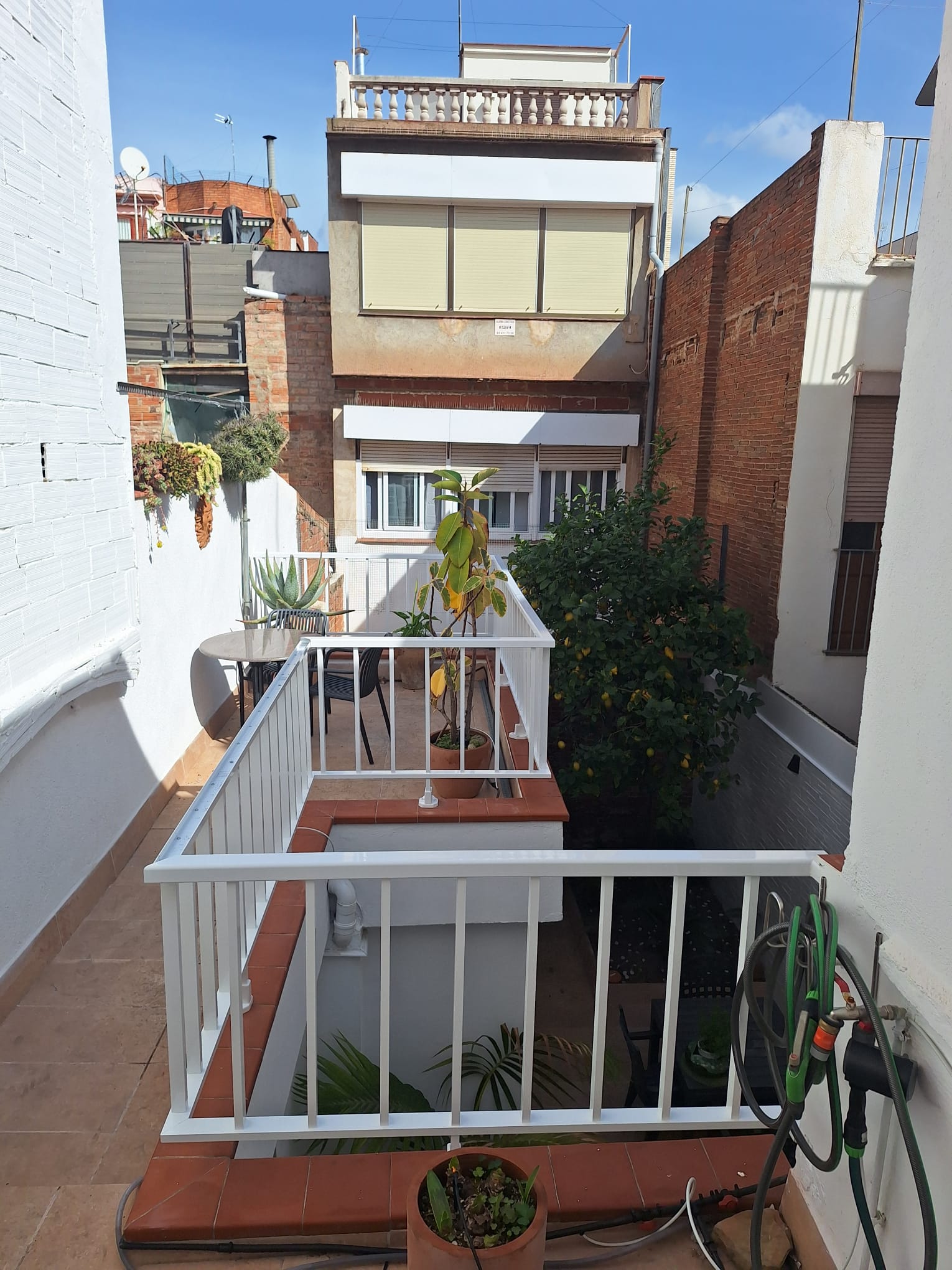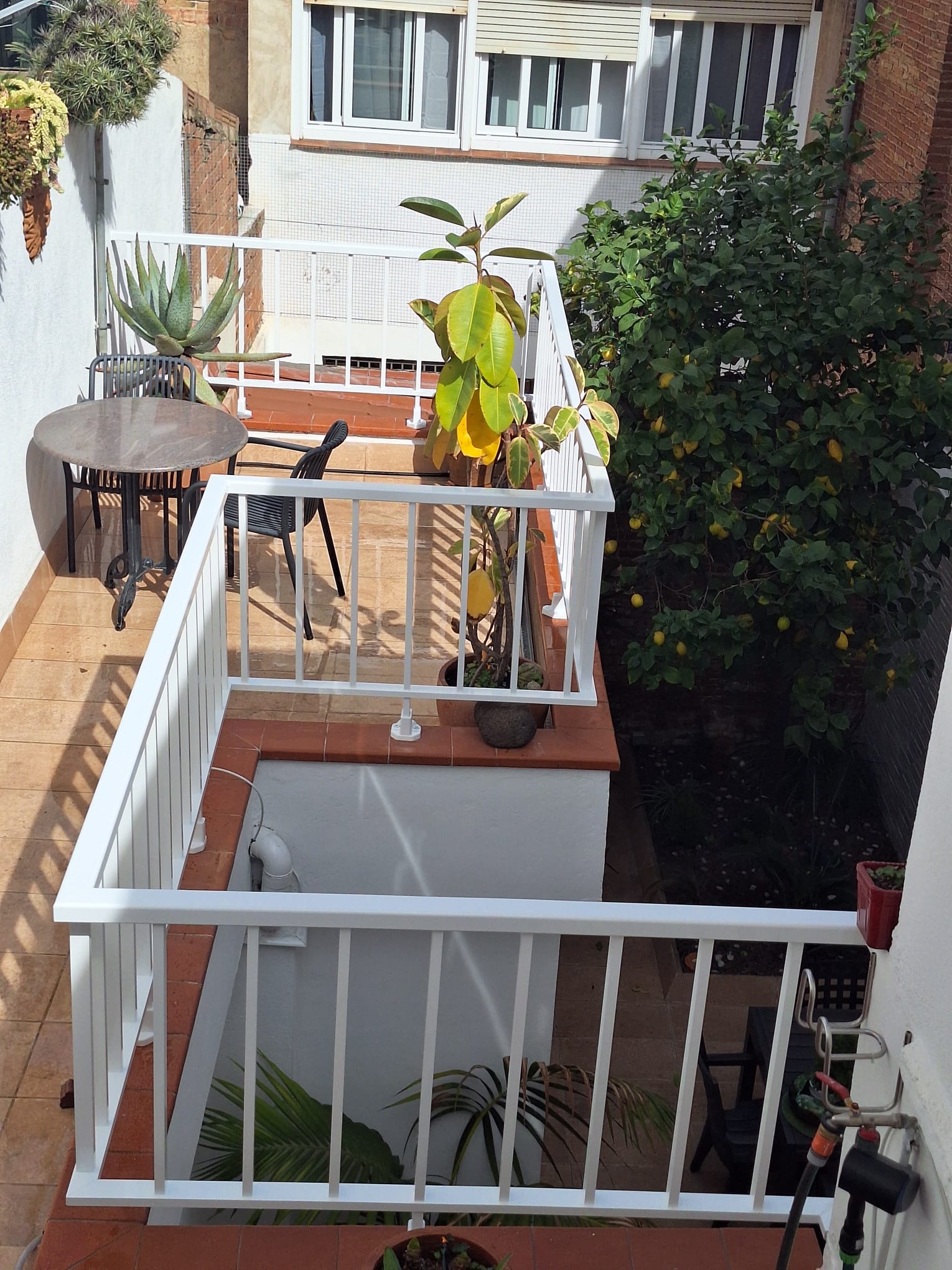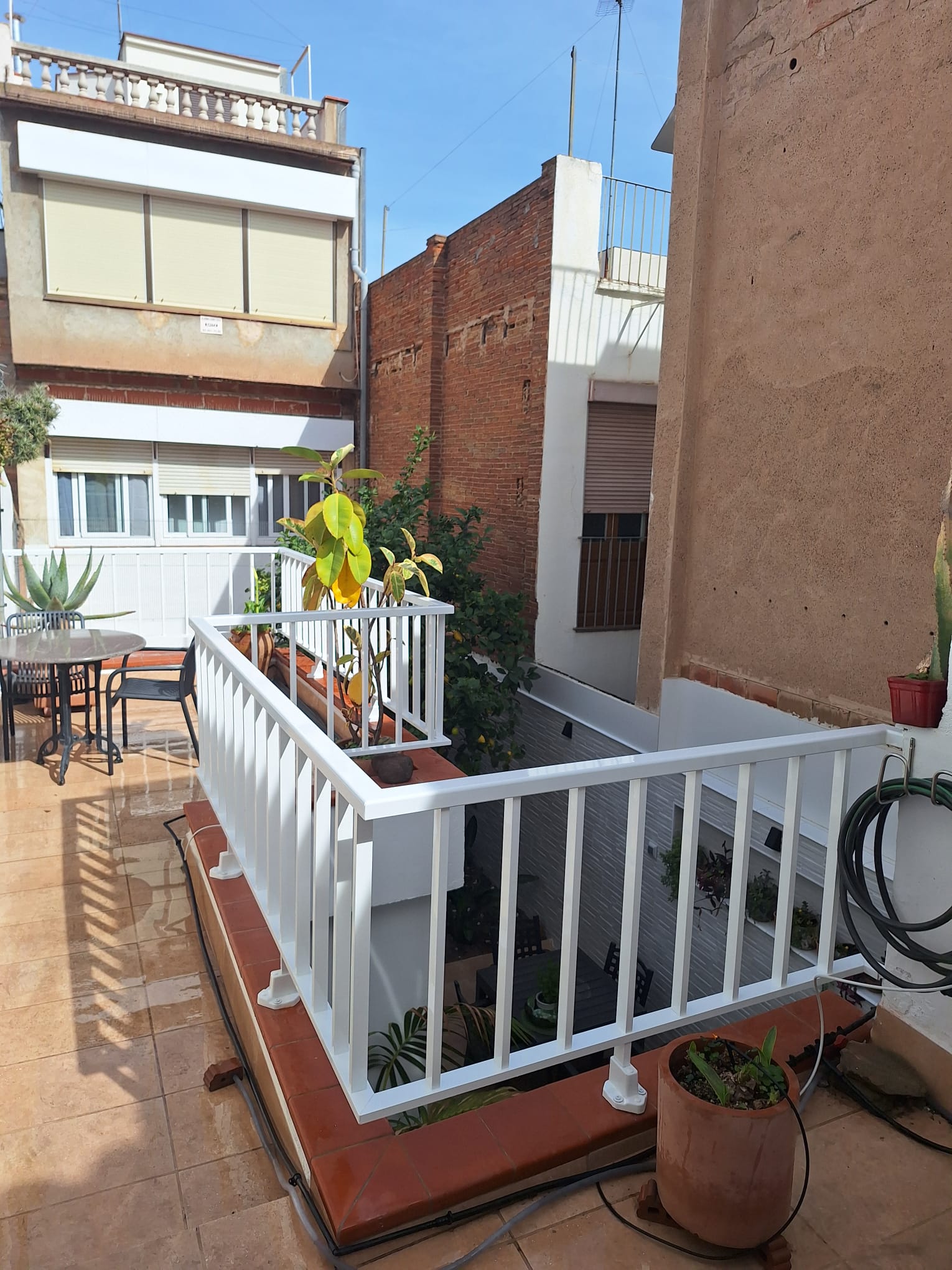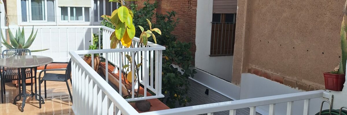 Aluminum railing with vertical bars in white lacquered. Measures 85 cm height x 10 linear meters. Installation with base to the ground, stainless steel rod and chemical block.